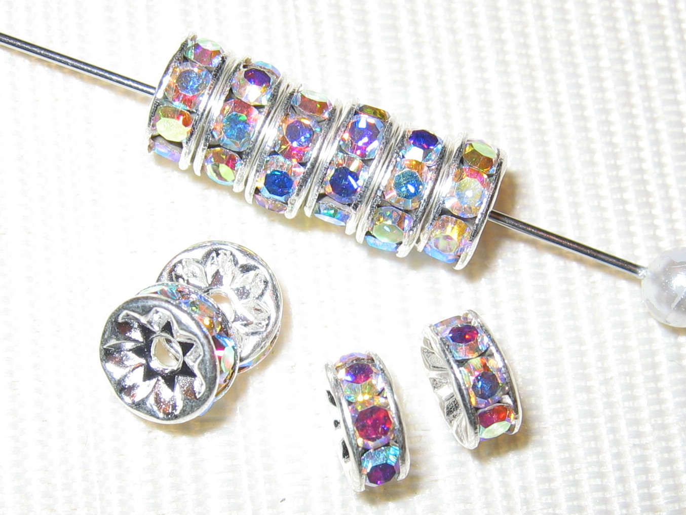 20 sparkling quality rhinestone rondelles. The size is 7 mm in diameter. The color is clear crystal AB.